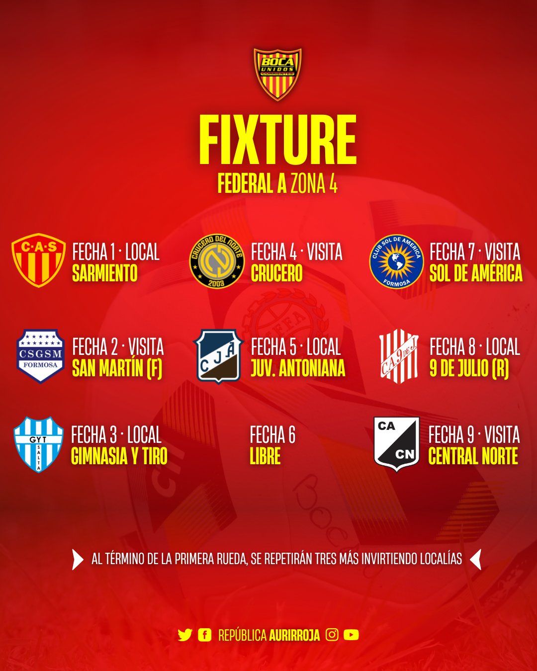 Después de su descanso volverá a la capital formoseña para cruzarse con Sol de América, equipo que ascendió a la categoría este año, y luego tendrá la visita del otro club ascendido, 9 de Julio de Rafaela, en el Leoncio Benítez. Su último rival de la primera rueda será Central Norte y por este motivo, viajará por única vez a Salta en la primera rueda.